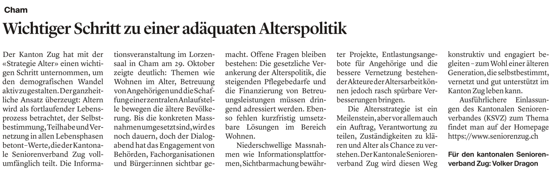 Thema: Altersstrategie 2023 bis 2035 der Stadt Zug – Die Stadt Zug leistet Pionierarbeit